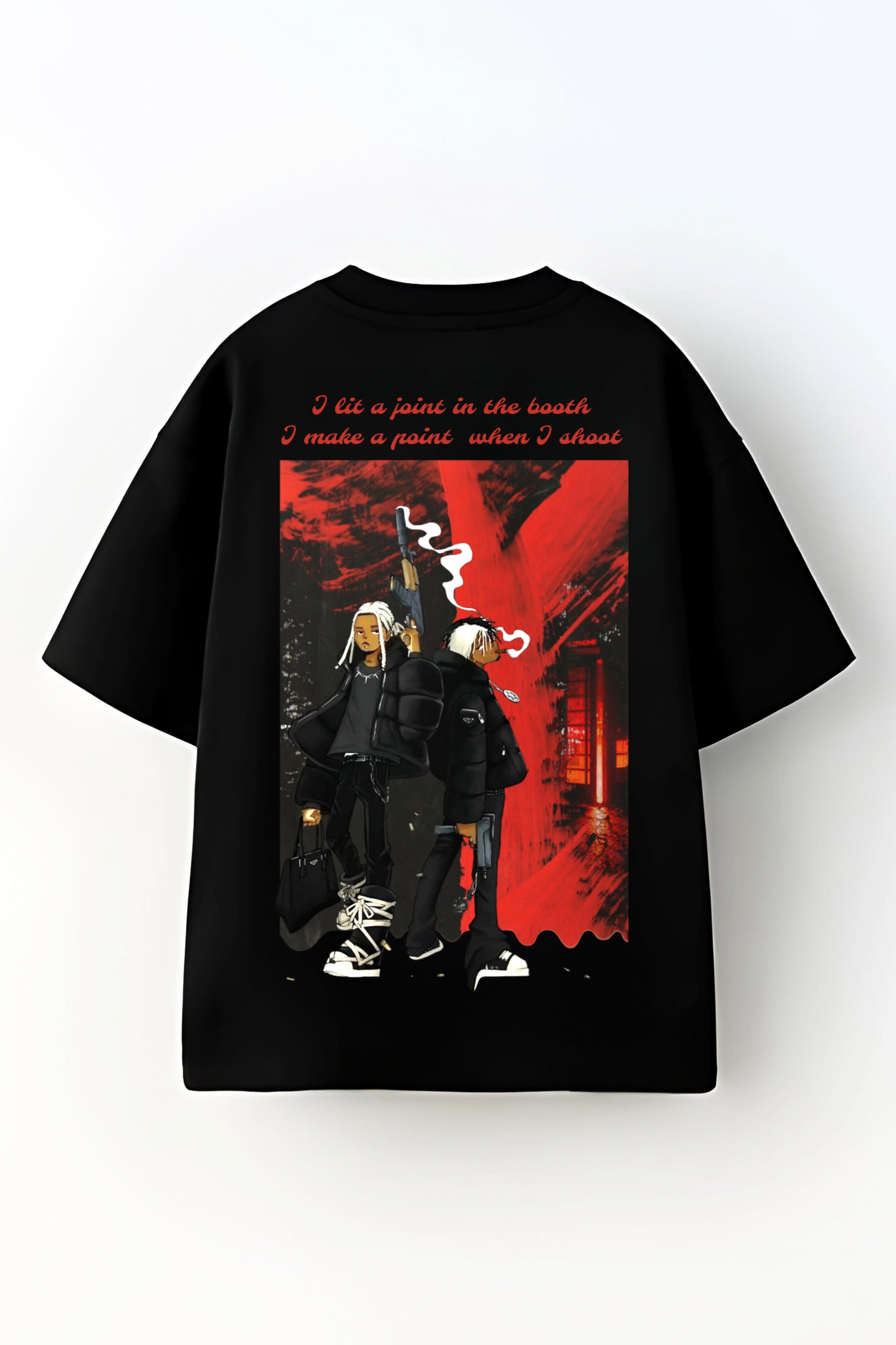 THIS TEE REFLECTS OUR INHERENT GENEROSITY, SUGGESTING THAT WE ALL HAVE GIFTS TO SHARE. IT MENTIONS A JOINT FOR MY FRIENDS AND .60 FOR YOUR CREW, ILLUSTRATING THE DILEMMA OF CHOOSING WHICH PATH TO TAKE FIRST, ALL WHILE ACKNOWLEDGING THE INEVITABILITY OF DANGER. THE IMAGERY OF A BULLET HOLE EVOKES INTENSE THOUGHTS, AND THE HIDDEN HAIL MARY SYMBOLIZES A LAST RESORT THAT COULD LEAD TO SEEDHE MAUT.